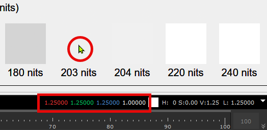 | 図8. 203 nits の AVIF パッチの値 | 図9. 背景の SDR の白色の値 |